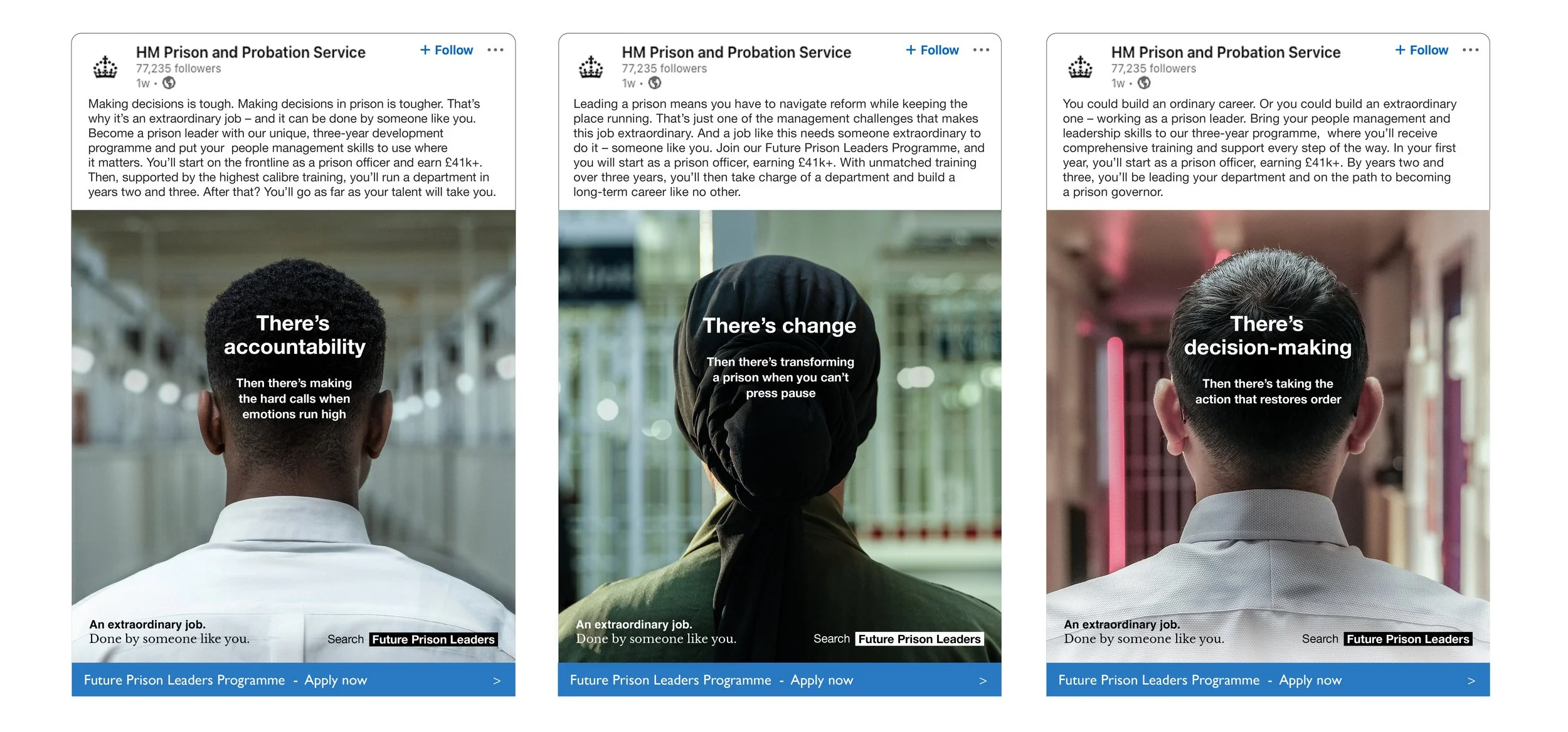 This campaign redefined what leadership looks like and where it happens. Aimed at experienced professionals considering a career change, the campaign challenged assumptions by presenting prison leadership as one of the most demanding, rewarding and socially impactful paths available.